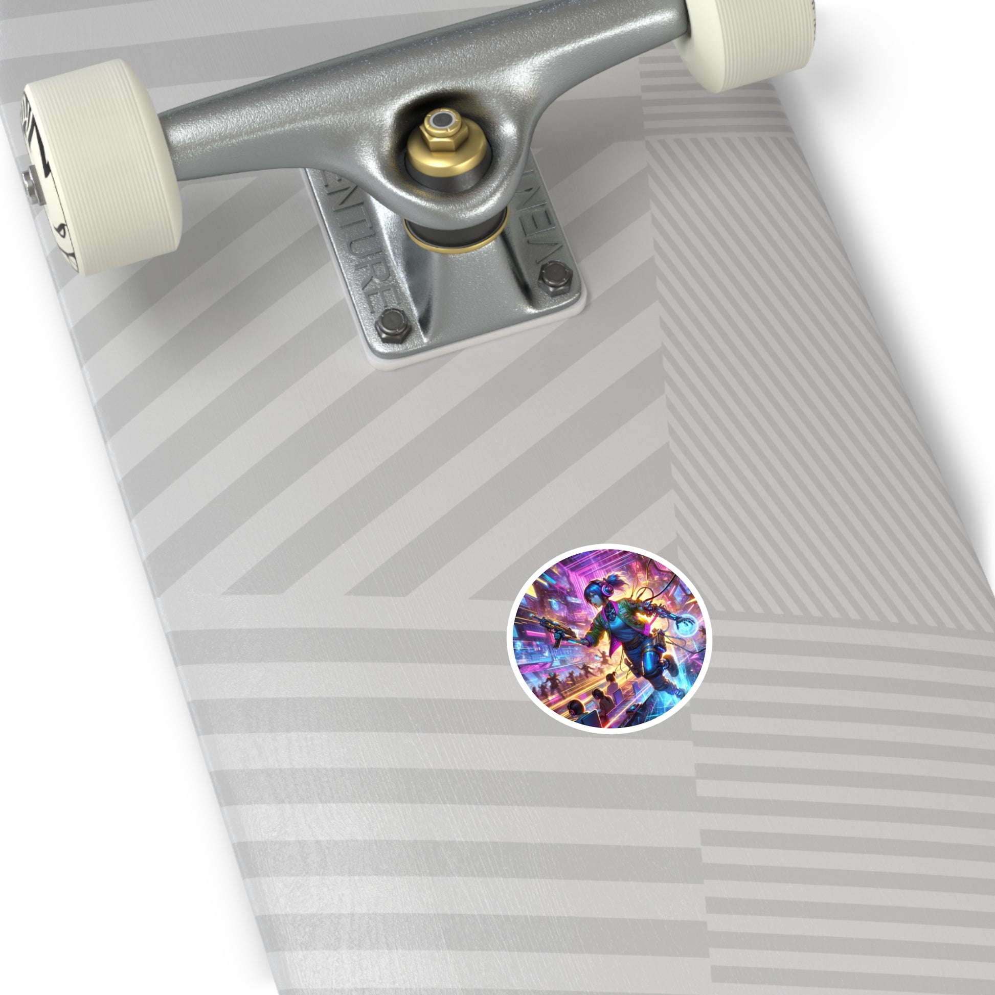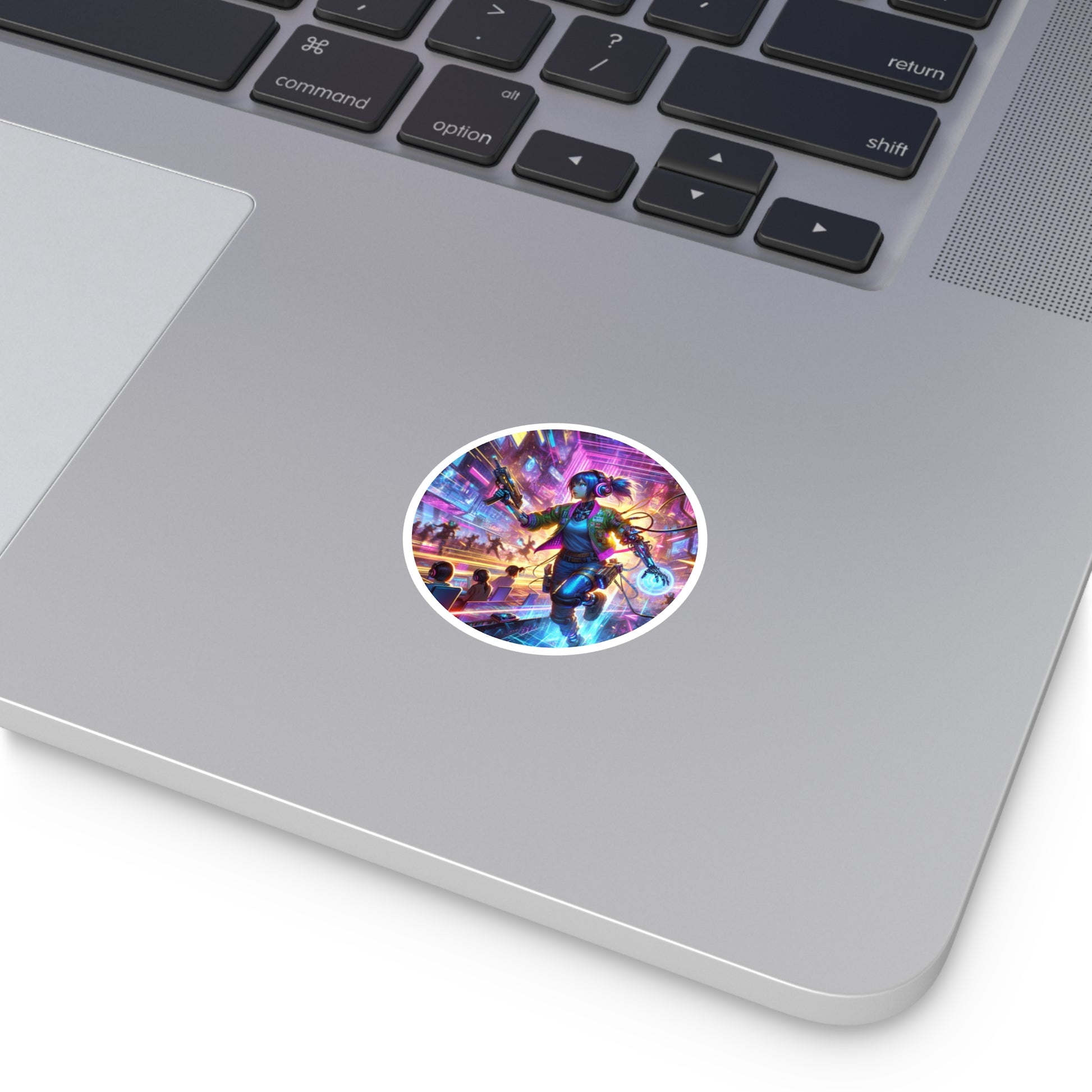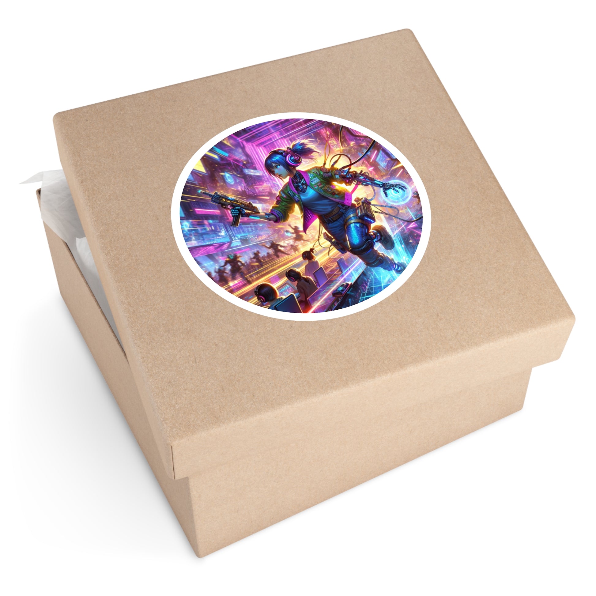 Vibrant and durable round stickers featuring an illustration of a cyborg girl gamer in a futuristic virtual reality gaming arena. Perfect for anime enthusiasts and those who enjoy cyberpunk atmospheres. Ideal for decorating laptops, notebooks, water bottles, and more. Great for tech-savvy individuals and gamers. Relevant for gaming conventions, anime expos, and tech events.